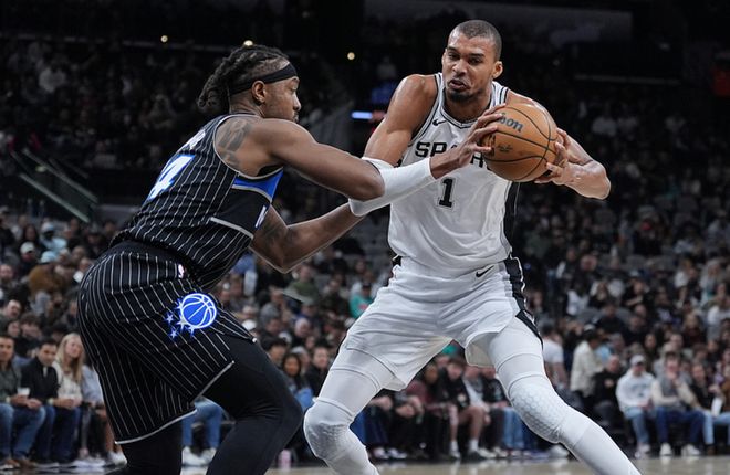 馬刺主場迎戰魔術,馬刺少瞭卡斯爾,魔術少瞭小瓦格納,首節比賽馬刺贏瞭16分,第二節魔術贏瞭17分反超1分,下半場比賽馬刺重新占據上風,最終馬刺112-103擊敗魔術。文班13中7得到25分8板2助4斷5帽,福克斯14中7得到14分3板10助,哈珀12中6得到15分6板5助,魔術方面貝恩17中10得到25分4板4助,班凱羅12中6得到19分10板4助。