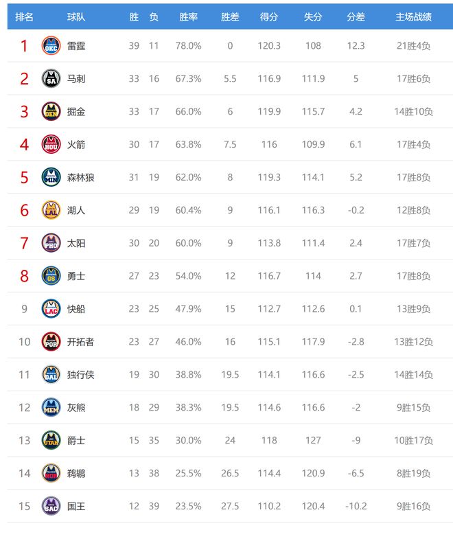 雷霆贏球後39勝11負排名聯盟第一,掘金輸球後33勝17負,排名從西部第二掉到第三,今日贏球的馬刺成為第二。掘金、湖人、太陽今日都輸球,給西部第四的火箭送上大禮,火箭和掘金的差距縮小到1.5個勝場,火箭領先湖人、太陽的優勢來到1.5個勝場。