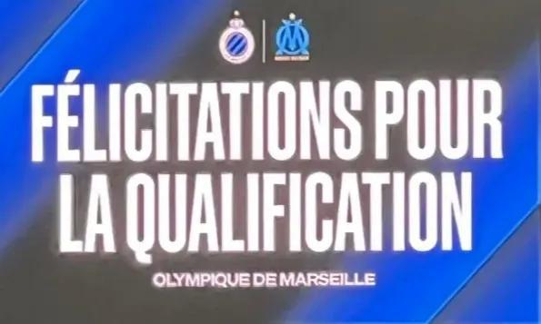 赛后,双方球员在球场上握手致意,此时已经锁定附加赛名额的布鲁日,特意在球场大屏幕上打出了一条祝贺语:“恭喜马赛晋级。”